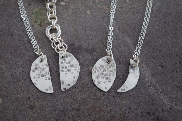 These necklaces began life as a sheet of sterling silver. I cut each shape out with a handsaw, hammered it to create the mares (who else took astronomy?), drilled the holes, filed the edges, and cut the jump rings!