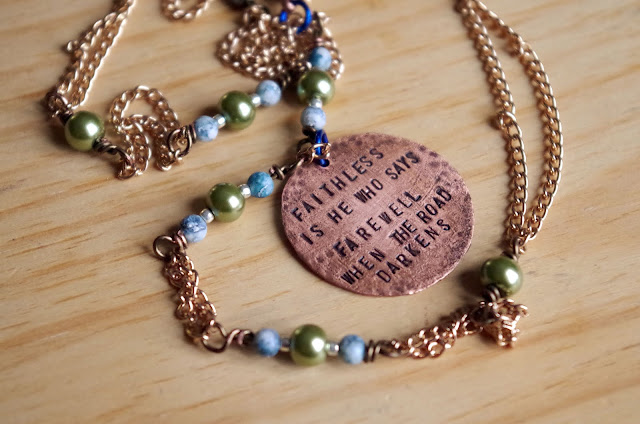 Also, three cheers for nerds! I get to make the best jewelry sometimes. :) This custom piece has another beautiful LotR quote: "Faithless is he who says farewell when the road darkens."