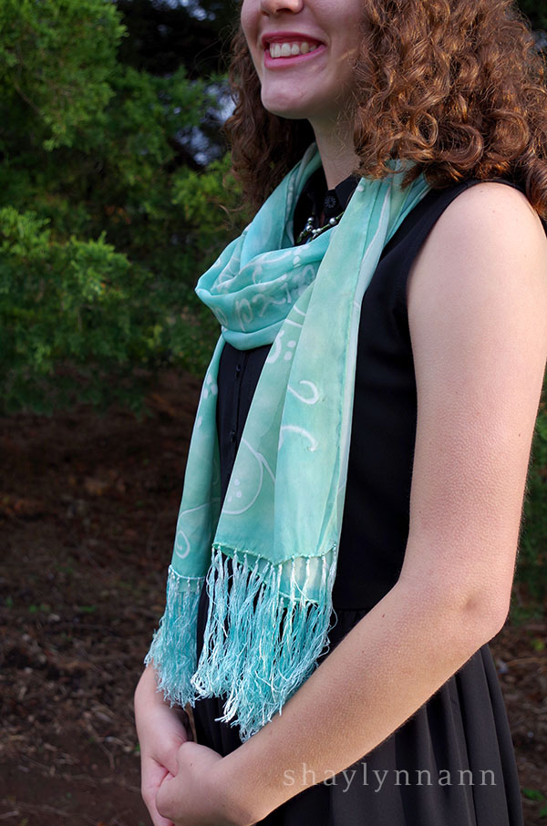 You can read a bit about the process in my previous blog post, but the short version is that I stretch the silk on a frame, draw the designs using resists, paint the dye on by hand and layer the colors over time, set the dyes, and then wash and iron the silks.