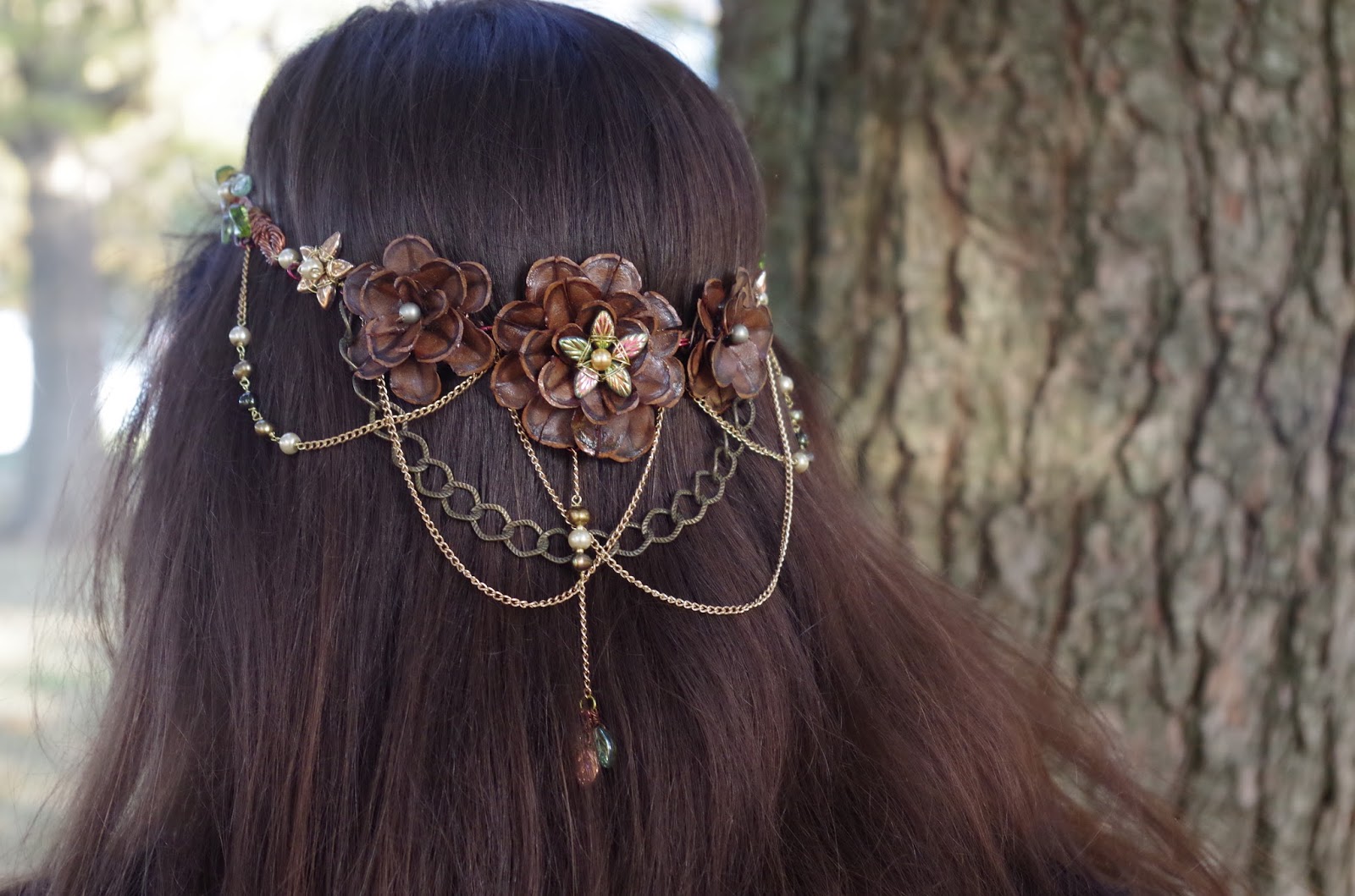 The commissions that make me the happiest are the crazy, intricate ones that I weave every ounce of magic into that I can. The Entwife headpieces (this is the fourth version) are among my favorites: they are crafted from pinecones, Czech glass, copper oxidized to several rich shades, creamy pearls, and weeping-willow chains.