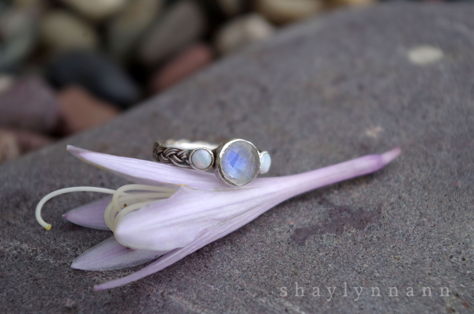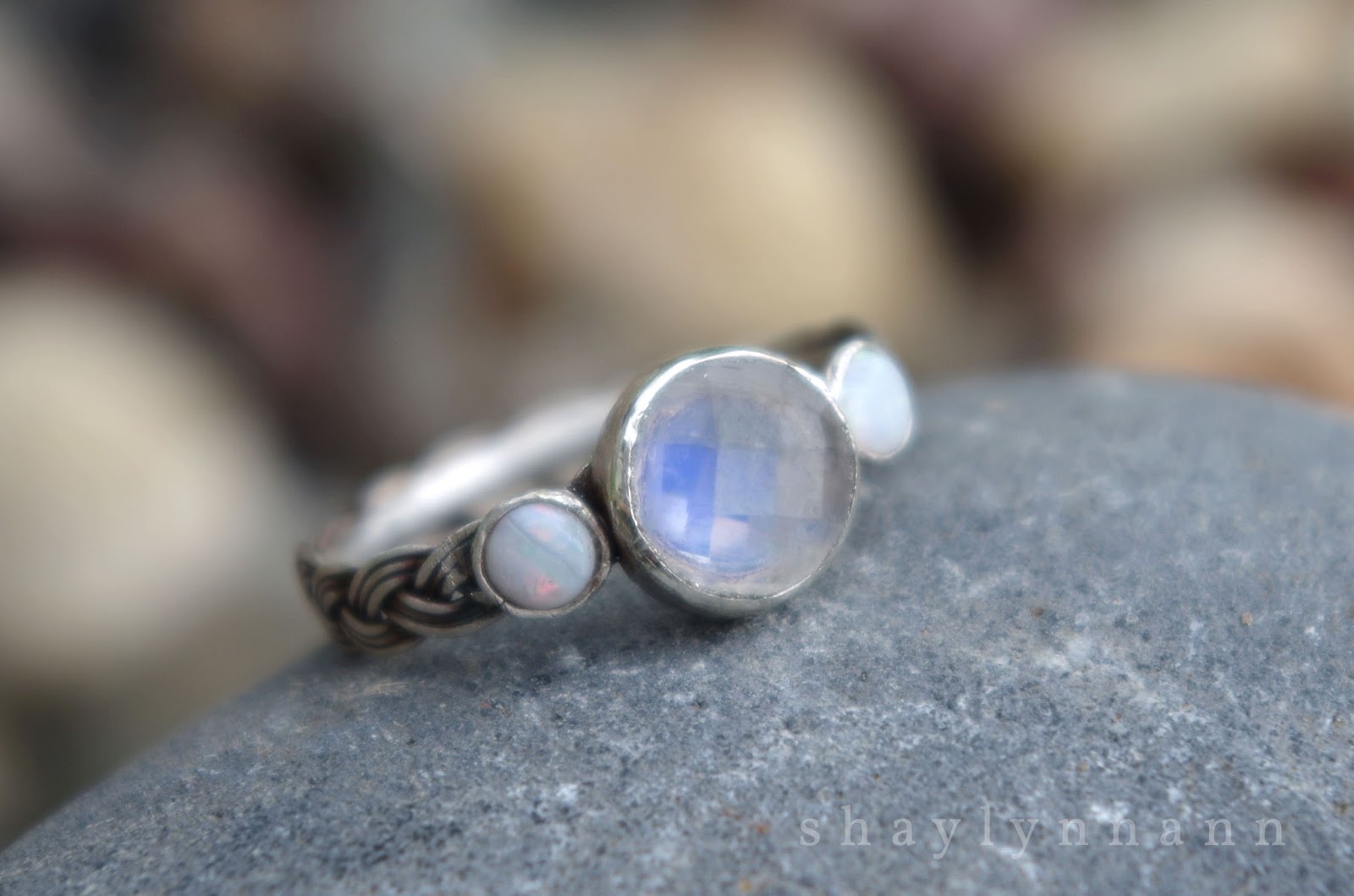 This commissioned ring is handcrafted from fine silver and highlights a stunning moonstone and two opals.