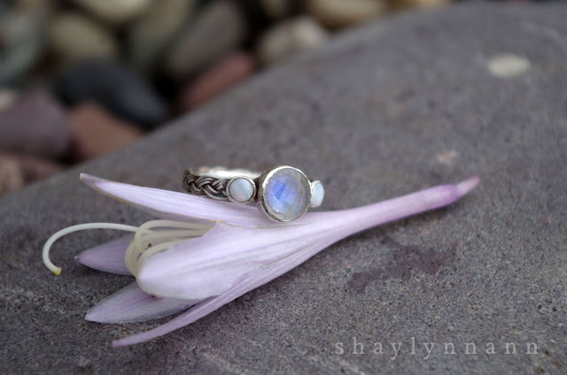The band is made from extremely thin strands of fine silver which were braided, reinforced with a strand of half-round silver, and soldered to size. This actually took two tries; ring sizing is no easy task!